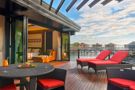 1,650sq ft, the resort’s most prestigious accommodation. Palm Villa marries Bornean simplicity and contemporary opulence. A glass floor in the room allows you to glimpse into the glistening waters, and a stairway at the private balcony leads you directly into the sea. You could also opt for a relaxing dip in the private plunge pool on the deck.